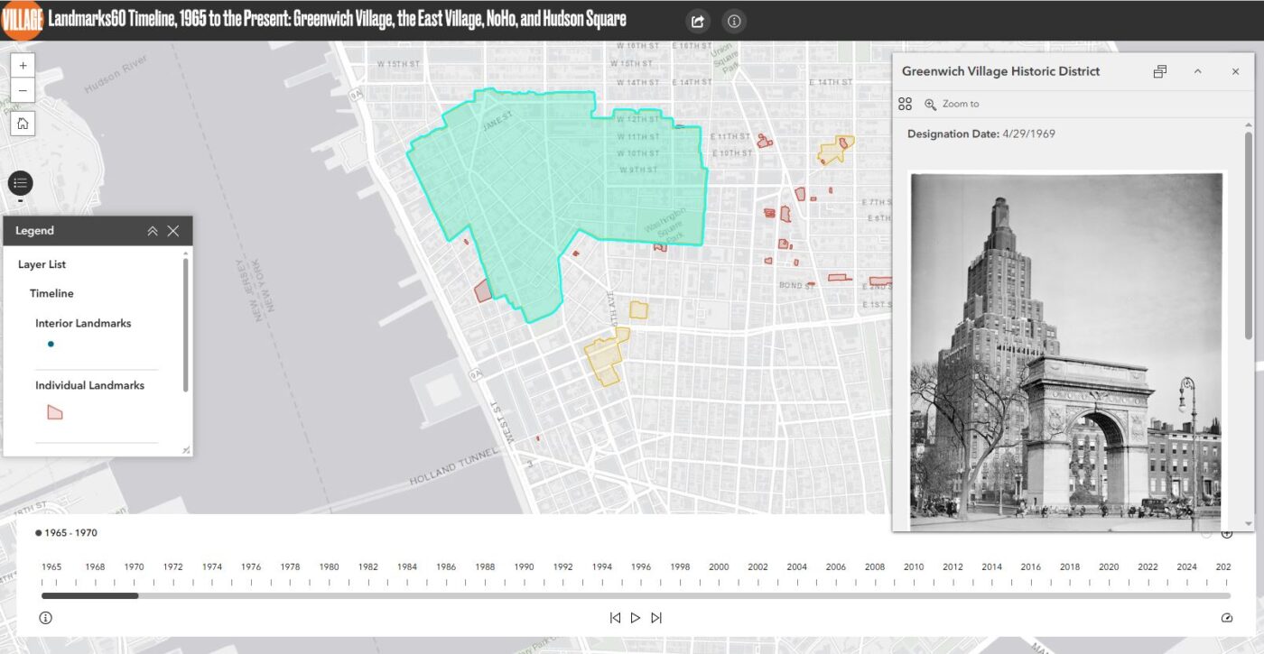 Village Preservation’s Landmarks Timeline Map shows every landmark and historic district designated by the NYC Landmarks Preservation Commission in Greenwich Village, the East Village, NoHo, and Hudson Square since the enactment of the New York City Landmarks Law on April 19, 1965.