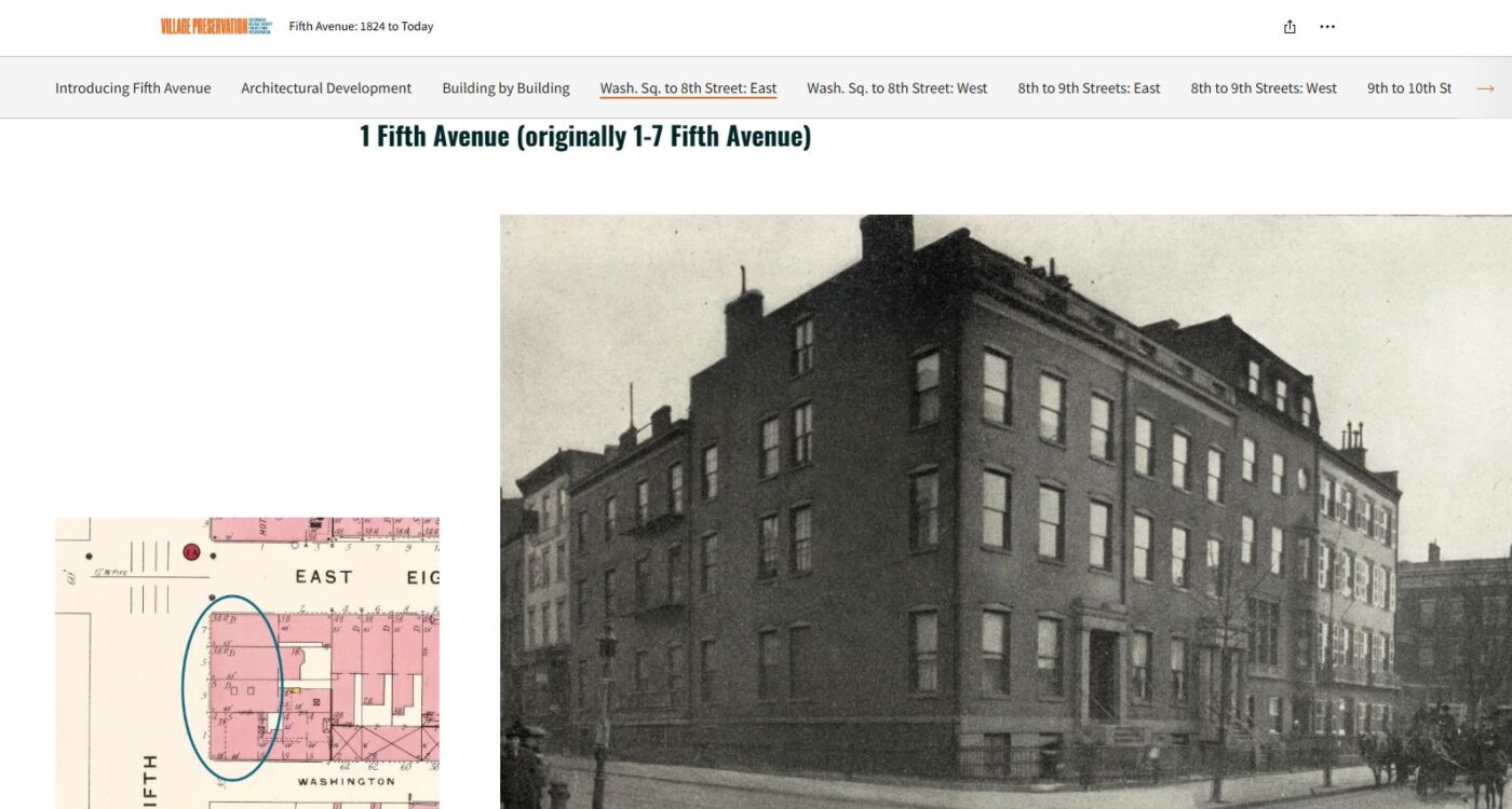 The designation report goes on to describe the buildings that occupied this site prior to One Fifth Avenue’s construction in 1926, which brings us to our next Village Preservation mapping resource…