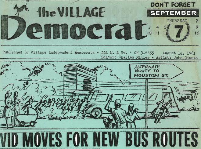 In August of 1961, the Village Independent Democrats (VID), a reform democratic club, were working to reroute city buses out of Washington Square Park. Although the park was closed to traffic in 1958, it was still used as a bus turnaround into the early 60s. The VID worked with Village Residents to advocate for a propose an alternate route, closing the park to traffic for good. This battle is documented in our Village Independent Democrats Archive collection, that can be explored here.