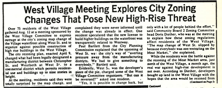 In August of 1986 the West Village Committee was hard at work fighting a proposed West Village Rezoning, that would allow the construction of high rise buildings in the far West Village. Founded as The Committee to Save the West Village, the West Village Committee was formed by Jane Jacobs and neighbors to defeat a Robert Moses urban renewal plan for the West Village. The collection includes meeting minutes, notices, correspondence, newsletters, and related articles from 1961-1997. The archive documents decades of preservation battles, the construction of the West Village Houses and more. Explore the entire collection in our Preservation/ Neighborhood History Archive.