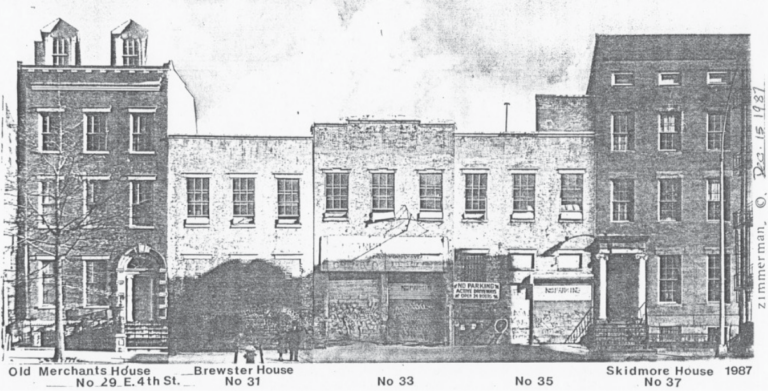 On August 18, 1970, New York City’s Landmarks Preservation Commission landmarked the Greek Revival gem at 37 East 4th Street. Often referred to as the Samuel Tredwell Skidmore House, it was constructed 1844-45 by leading businessman Samuel Tredwell Skidmore (1801–1881). Skidmore was a cousin, once removed, of Seabury Tredwell of the Merchant’s House Museum, located just a few doors down the block at 29 East 4th Street.