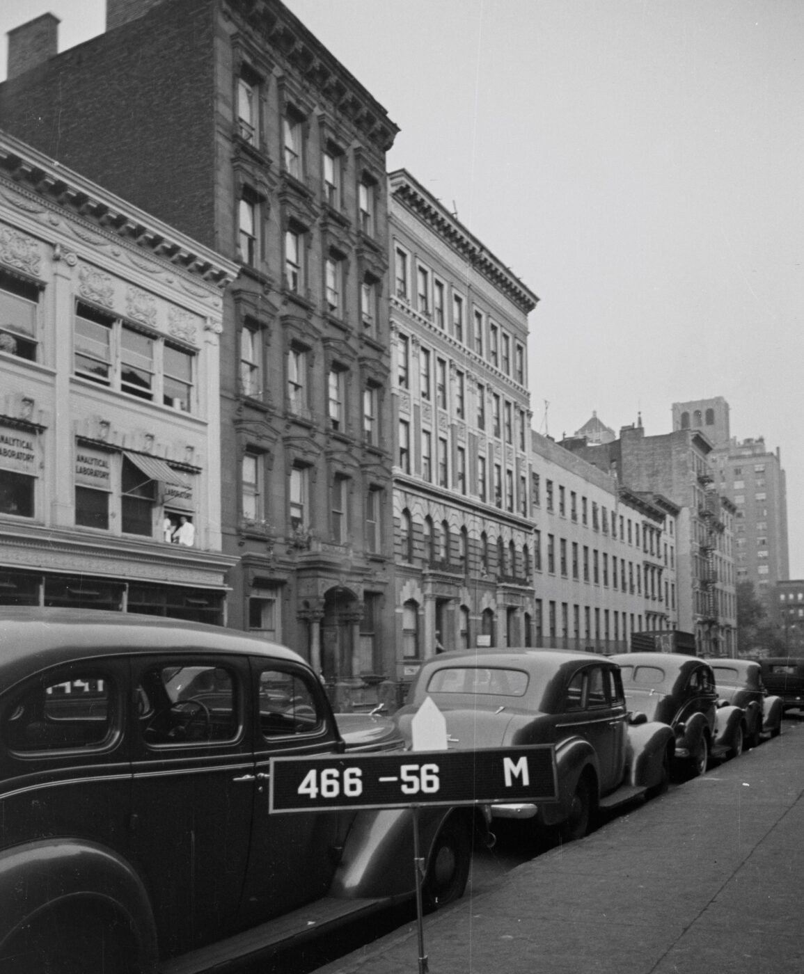 The signs on the windows clarify this further, with lettering that states “ANALYTICAL LABORATORY” and “CHEMISTS.” (Click here to view the original image source, where you can zoom in to better make out the words.) Beyond these announcements of use, the window dressings serve to cover the glass and may indicate that delicate procedures, perhaps sensitive to light or that require privacy, are taking place on the upper floors. More hints that point toward possible issues of light or temperature sensitivity are the window awnings seen open over the rightmost windows — these types of coverings were also used at residential buildings to protect interiors from excessive solar heat before the common use of air conditioning.