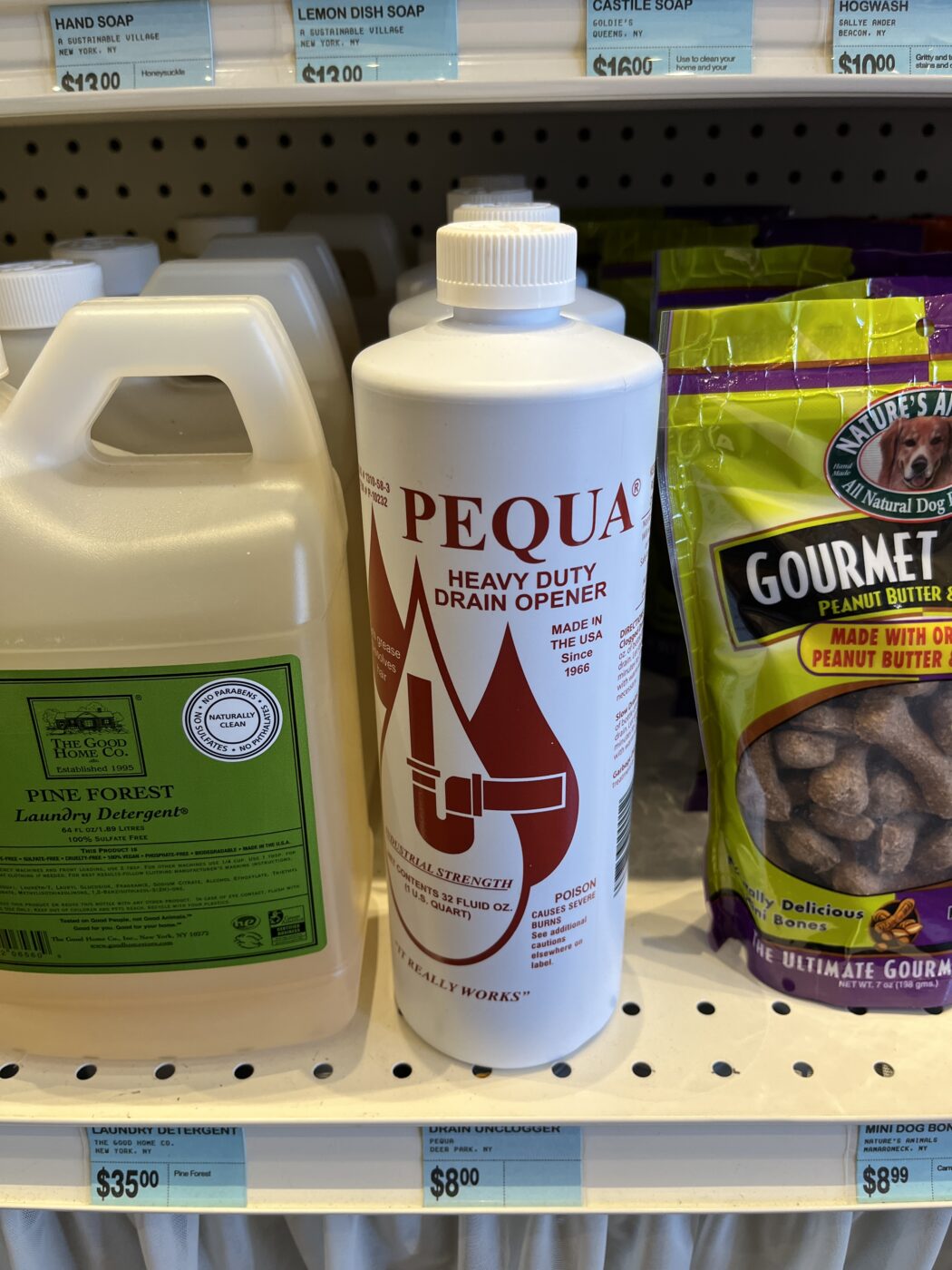 A locally-produced alternative to Drano that does not corrode your pipes (because it’s potassium-hydroxide-based).
