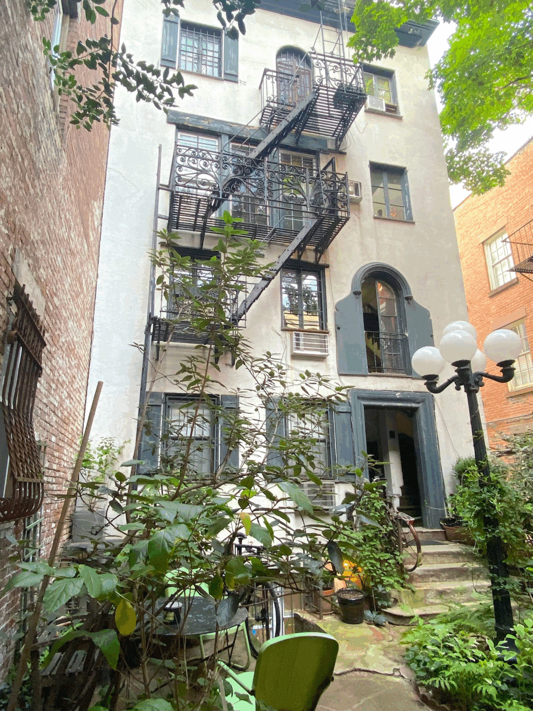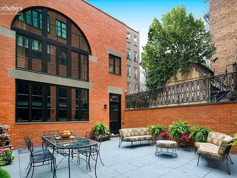 Although architecturally modest and simple, 93 Perry remains one of the West Village’s most eye-catching homes, adorned with a series of simple yet charming features. From the front, the elongated window on the second story is accompanied by a small cast-iron balcony. A high, two-tiered iron railing, above the cornice, runs along the width of the building. Through the archway to the front building’s left, crowned by an iron railing, is what’s perhaps most unique about the house — a hidden courtyard.