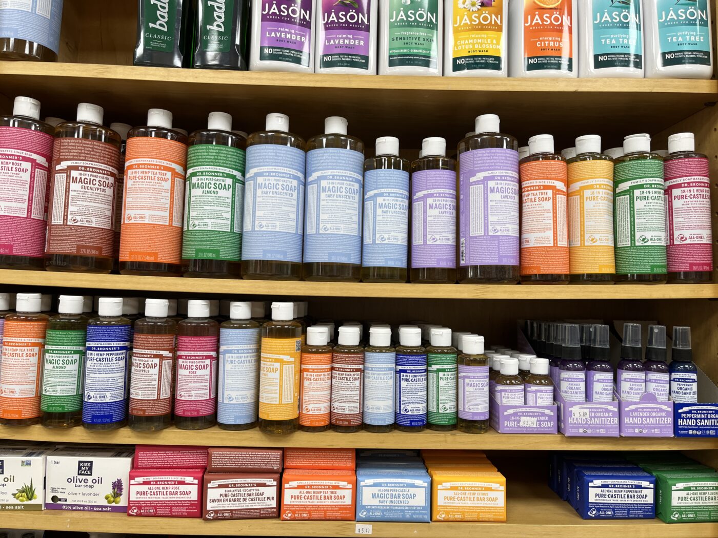 - Dr. Bronner’s castile soap, a plant-based multipurpose cleaner in all sizes and configurations made-in-California with raw materials sourced through fair trade partnerships.
