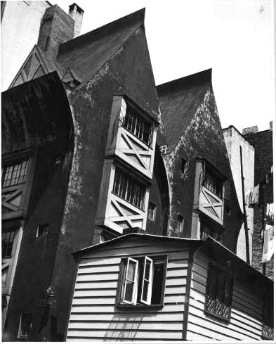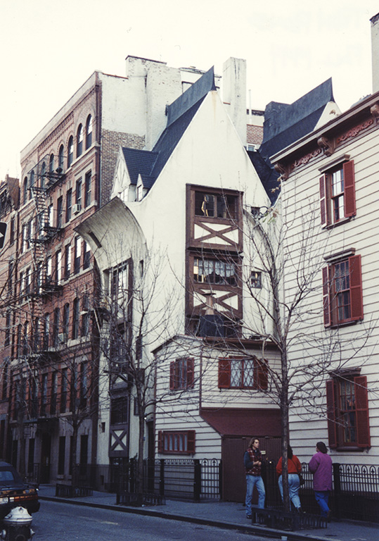 The festivities fit the fresh facade. As discussed in the Greenwich Village Historic District designation report from 1969, the home’s exterior includes large casement bay windows that project from the facade of the building and are framed by half-timbering. The halftimbered panels, below the windows, relate them to each other in a continuous vertical bay. The same treatment appears in two rows of bay windows on the south side of the building, centered under the two gables which gave the building its name–“Twin Peaks.” Later, the AIA Guide to New York City dubbed this architectural feature as pure Hansel and Gretel.