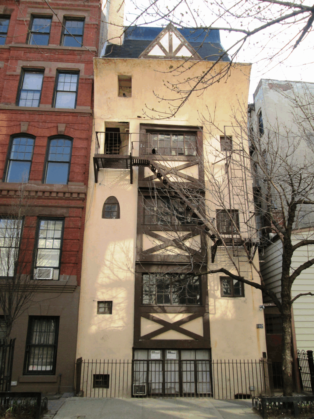 And so, with the help of his friend and financial backer, millionaire Otto Kahn, Daily purchased the row house in 1925 and transformed it into a five-story artist’s studio apartment building beyond recognition of its original form. Unlike many of the other structures found in the neighborhood, 102 Bedford was now distinguished by the decorative use of pseudo-medieval half-timbering with smooth stucco walls. Steep roofs with twin gables slope down to a deep overhang at the front, making the home undeniably unique. And after a year, construction was completed, and Daily’s dream building came to fruition.