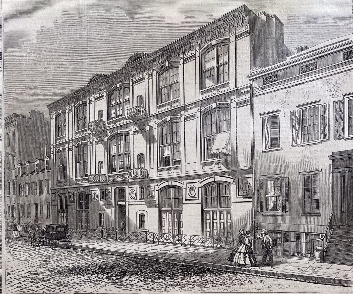 The single most important link between Hunt and Greenwich Village is the Tenth Street Studio Building, at 51 West 10th Street (between Fifth and Sixth Avenues). Commissioned by James Boorman Johnston and completed in 1857–58, the building was designed by Hunt specifically to house artists’ studios and a central gallery — a programmatic use that was revolutionary at the time. Its domed central gallery with radiating studios was not merely an architectural flourish: it created a social and commercial hub where artists, dealers, and collectors met, exhibited, and sold work. Within a few years the building had become the organizational center of New York’s art world, and the presence of so many artists helped push Greenwich Village from a semi-rural suburb into the city’s most important artistic neighborhood.