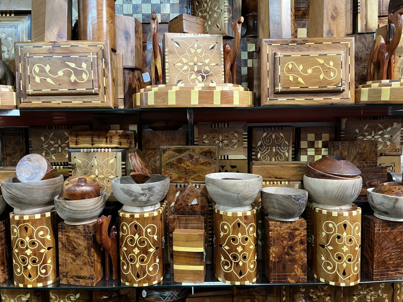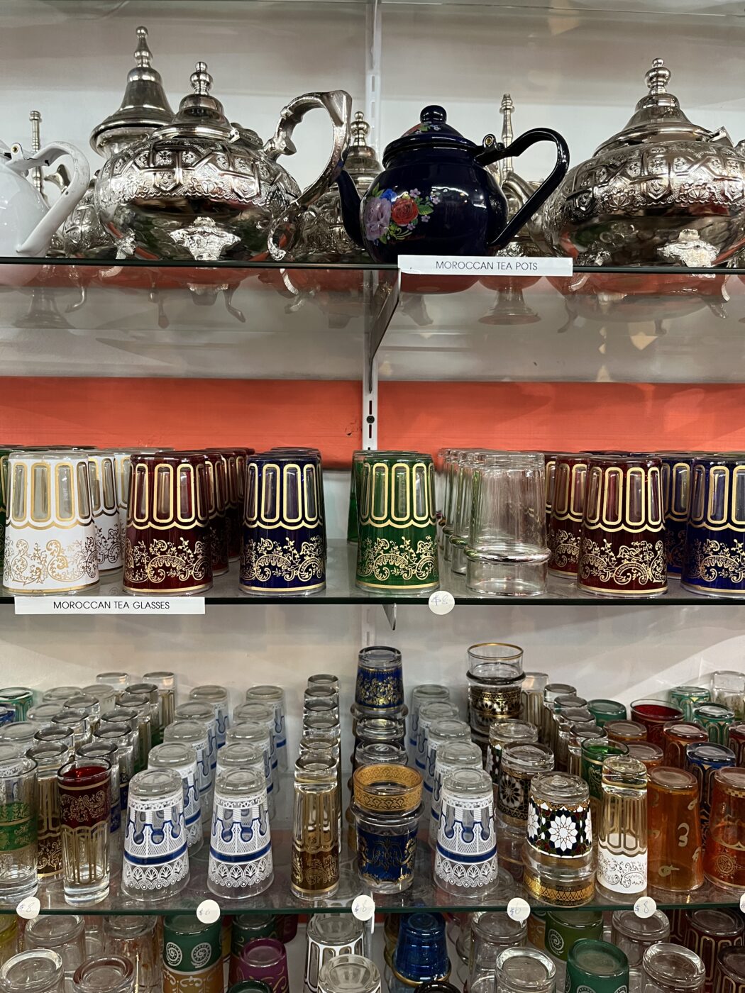 The glassware is not only intricately decorated, durable, and sustainably made from recycled locally-sourced materials, it also plays a central role in the Moroccan culture of hospitality. It’s what you use for serving mint tea. The store also carries handmade brass teapots in which you can brew it!