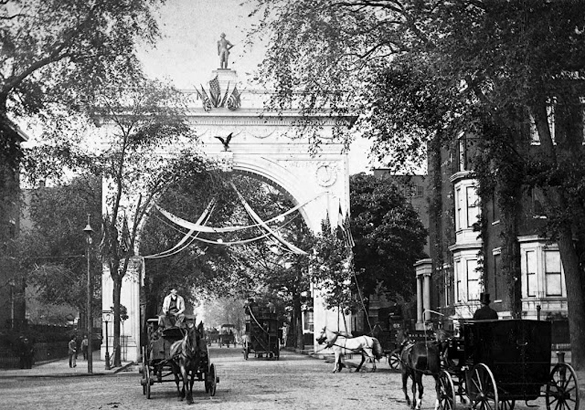 Nearly twenty years later, in 1889, the City set out to honor the one hundredth anniversary of George Washington’s inauguration in a three-day-long celebration at Federal Hall on Wall Street. Determined to have the festivities pass by his house, William Rhinelander Stewart of 17 Washington Square North commissioned architect Stanford White to design a temporary monument honoring President George Washington for the entrance to Washington Square Park. While at first the structure was temporary papier-mache and white plaster, the arch became a permanent, marble installation after garnering widespread public support.