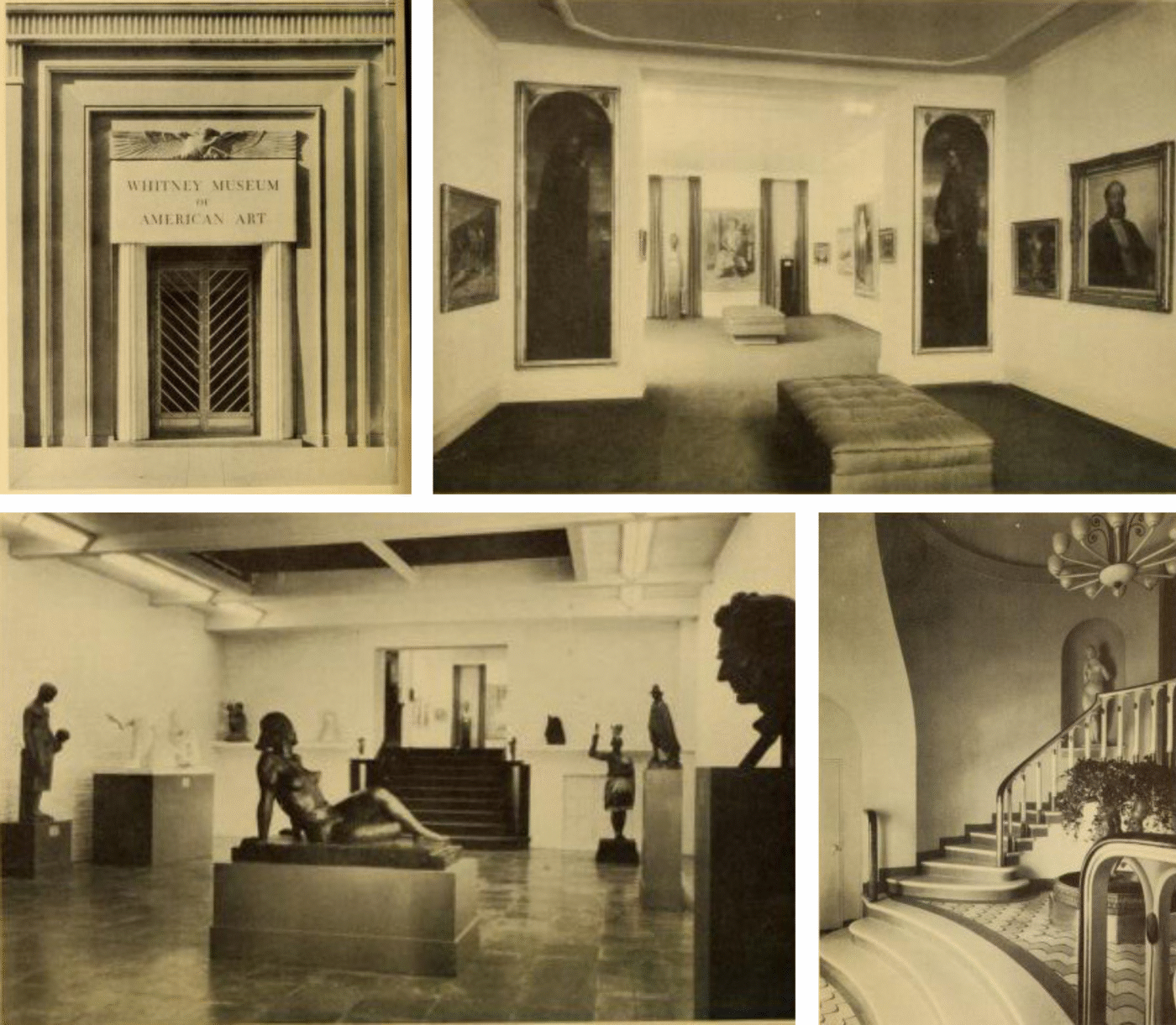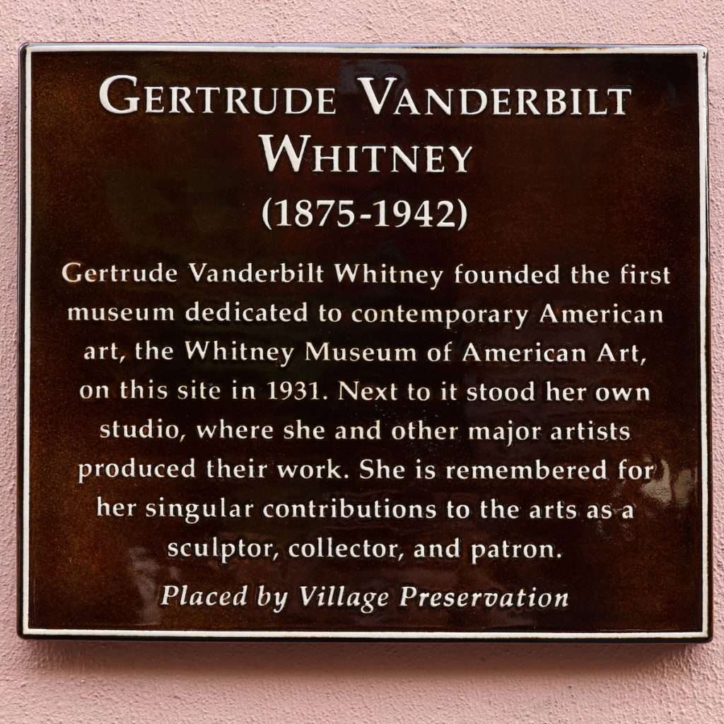 In Manhattan, though she lived uptown with her husband, Harry Payne Whitney, until his death in 1930, her connection to Greenwich Village was solidified as early as 1907, when she converted a former stable on MacDougal Alley into an art studio for herself. Her formal education had followed a conventional path, but she quietly sought artistic training, studying sculpture in New York and Paris under respected artists. By 1910, she had begun exhibiting her work at her studio, publicly and under her own name (Prior to that, she had been using a male pseudonym, fearing that both her status as a socialite and as a woman would impact perception of her as an artist.). In 1914, she connected the MacDougal Alley building with the adjacent townhouse at 8 West 8th Street, and in 1931, following her husband’s death, she converted the complex into both a residence for herself and a gallery — the first location of the Whitney Museum of American Art.