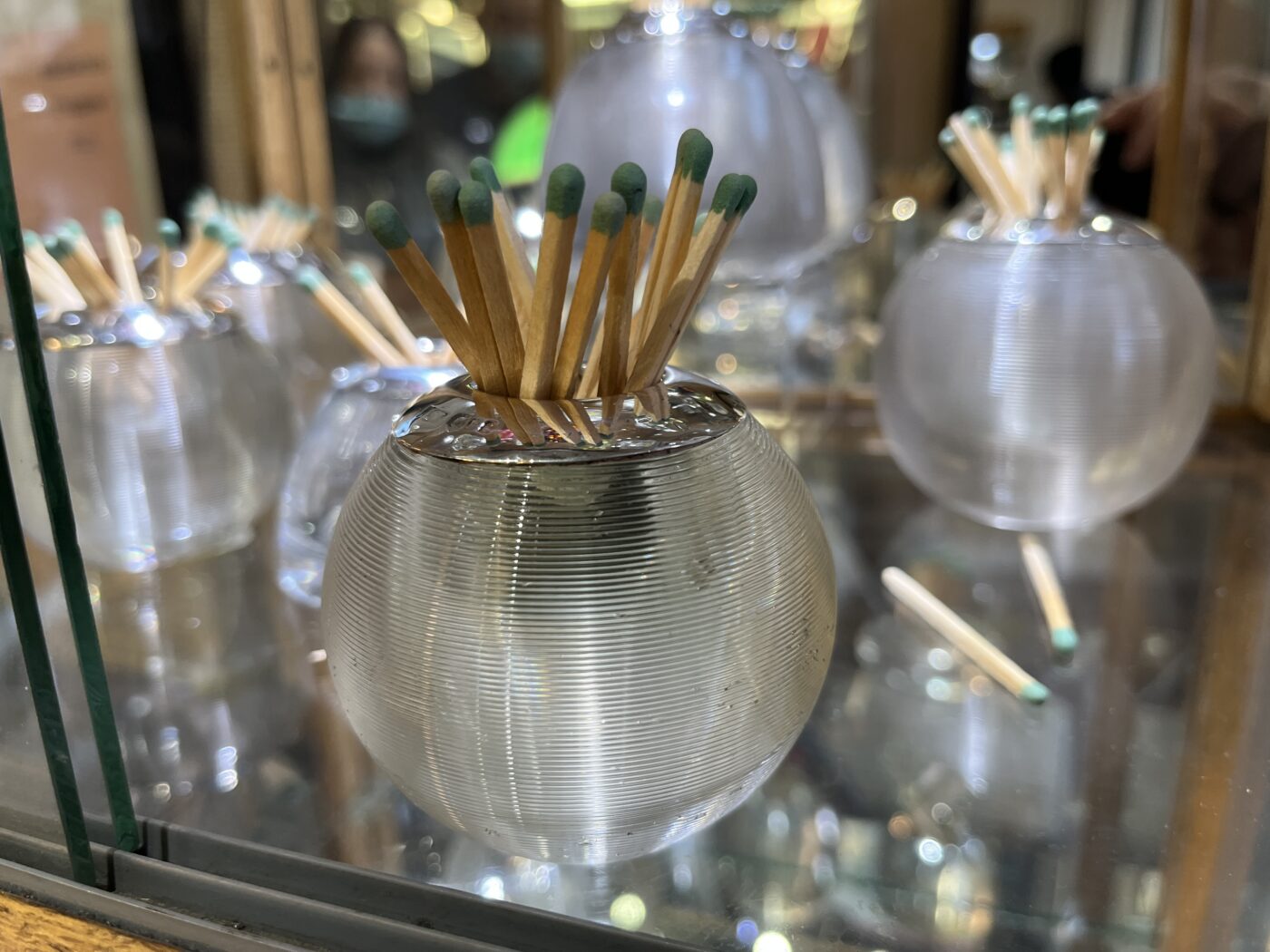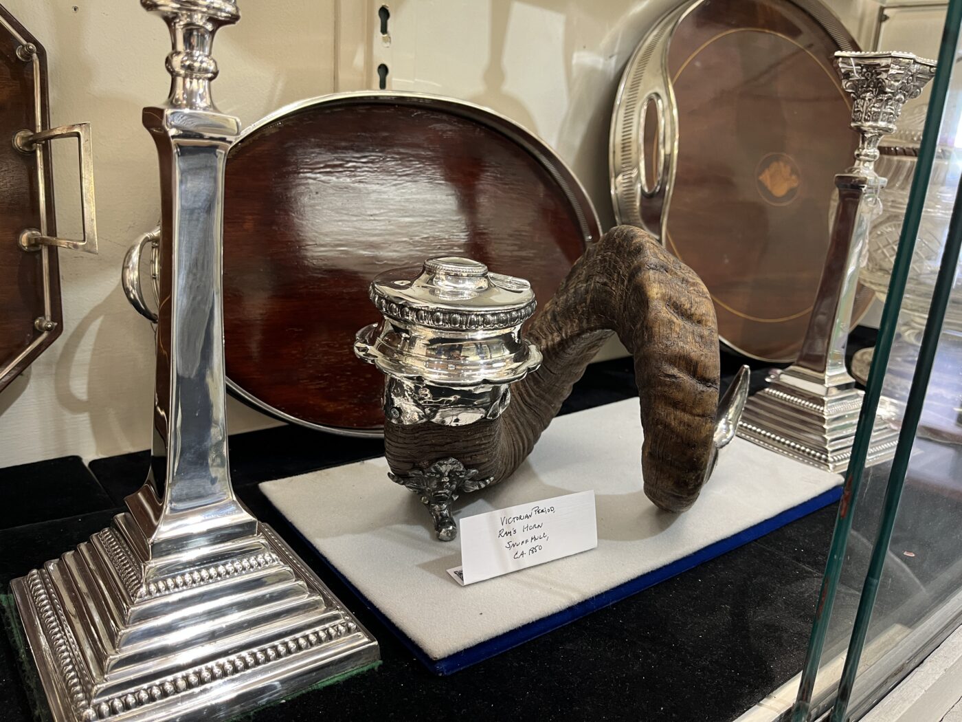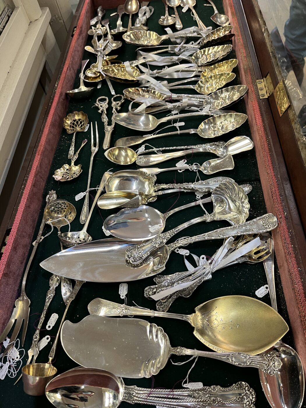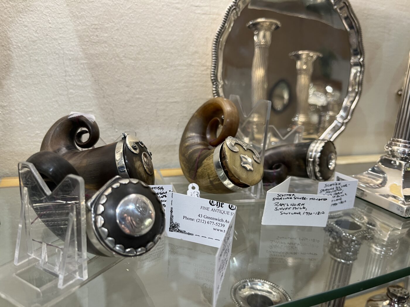 Tudor Rose’s selection comprises a wide enough range of items that you’re bound to find a special gift there for anyone, including yourself, regardless of whether you’re looking for a calling card case, a candle stick holder, a goblet, or a magnifying glass. The merchandise does, however, reflect the taste of Howie and Myre. And the couple shares a fondness for British and American silverwork from the 1800s through the early 1900s, a period during which form, however ornamental, followed function—and the more specific the function, the more it served as a marker of distinction. Anyone may own shears; but only the discerning would own a beautifully ornamented pair with a serrated edge intended to facilitate grape stem cutting. A spoon is a spoon; but only special spoons are designed specifically for scooping out Stilton cheese. This makes the store an ideal place to shop for people with very specific needs (such as grape and Stilton cheese eaters); but not only. Years of experience have taught Howie and Myra how to repurpose even the most specialized of items. So you can also let yourself be drawn to whatever catches your eyes and let them tell you what you might use it for. Here are some of the items that caught ours: