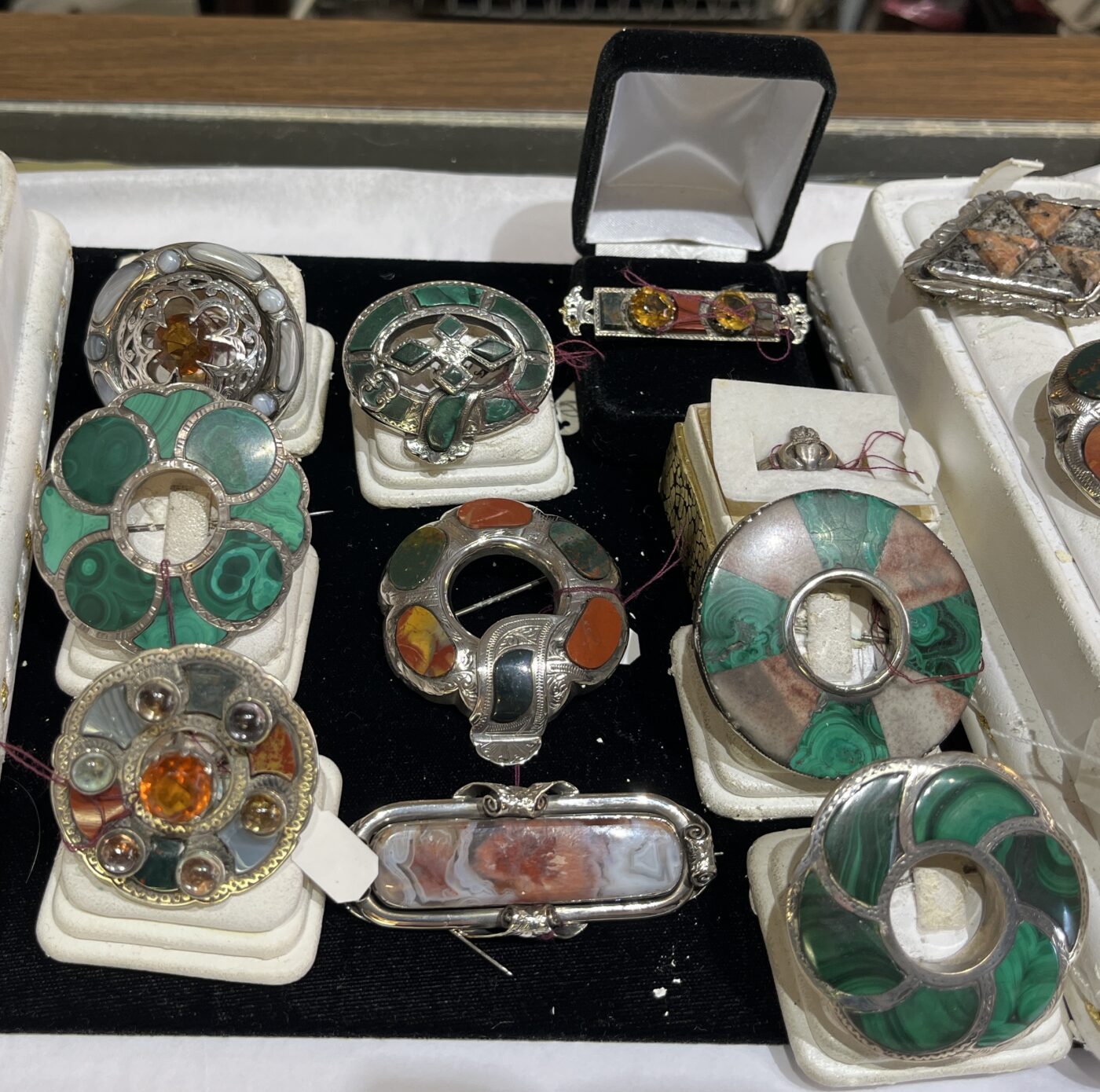 Victorian agate brooches from the 1880s for kilts, tams, and shawls: