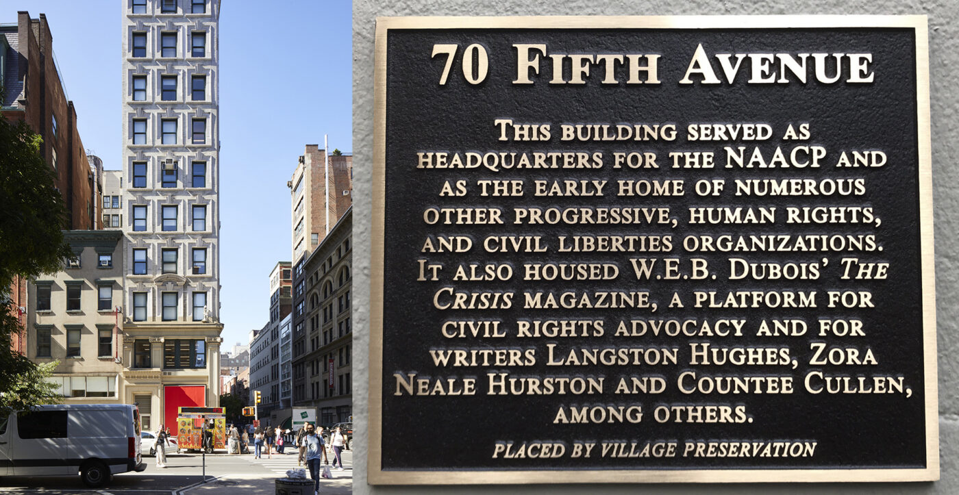 One essential site that we succeeded in getting landmarked is 70 Fifth Avenue. Designated shortly after that letter was sent, the building has been home to an amazing array of civil rights and progressive organizations throughout its history. It has been the headquarters of the Women’s International League for Peace and Freedom, founded by renowned women’s rights and peace activist Crystal Eastman, and the Woman’s Peace Party, led by Jane Addams, Carrie Chapman Catt, and Fanny Garrison Villard.