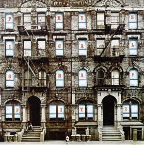 But the Rolling Stones were not the first rock and roll band to immortalize this East Village stoop. Just a few years earlier, in February 1975, Led Zeppelin released Physical Graffiti, an incredibly successful double studio album whose cover art features those same twin tenement buildings on St. Mark’s Place. The award-winning design featured the two buildings (with the fourth floors removed to make them fit the square shape of the album cover) with the windows cut out to reveal the letters of the album title printed on the inner sleeve, or, if the sleeve was reversed, a series of images of different characters seeming to occupy the building, including lead-singer Robert Plant in drag.