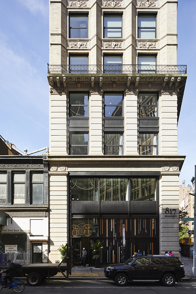 (l. to r.) 815 and 817 Broadway. The two-story neo-Renaissance–style galvanized iron-faced commercial building at No. 815 was constructed in 1897 by architect John C. Westervelt for the Roosevelt family. By 1910 it housed a branch of the Childs Restaurant, one of the first restaurant chains in America, whose later Coney Island building is a New York City landmark. No. 817 was built in 1895-98 in the Renaissance Revival style as a 14-story structure designed by George B. Post for William Weld. It housed various clothing companies, including Meyer Jonasson & Company, then known as “the world’s largest manufacturer of ladies’ garments.”