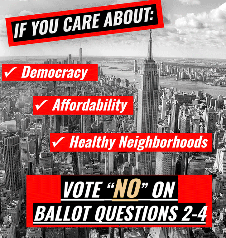 The deep-pocketed proponents of Mayor Adams’ charter revision ballot questions are spending millions to convince city voters to approve their deceptive power grab, which would harm affordability, democracy, and healthy neighborhoods. Disguised as “affordable housing” measures, these changes would grease the skids for developers; hand unilateral decision-making over to the Mayor; remove procedures for protecting neighborhoods; and limit opportunities for affordability, tenant protections, and anti-displacement measures. These measures would enable many oversized projects that would contain no affordable housing whatsoever, and some wouldn’t even contain housing. Even their definition of “affordable” is out of reach of the vast majority of New Yorkers.