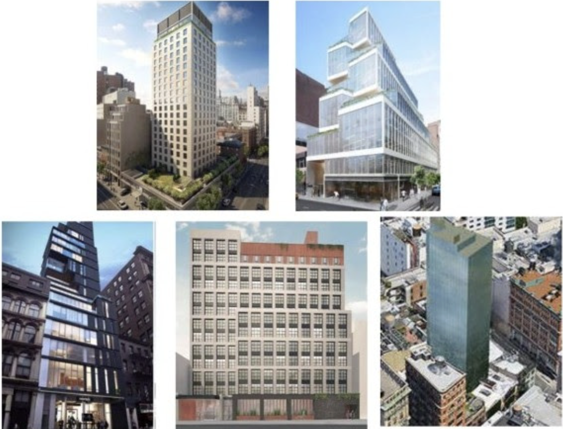 Developments Planned or Underway in the Area: (top, l. to r.) 285 ft. tall tower at 110 University Pl. (former Bowlmor site); one iteration of possible commercial office building at 799 B’way (St. Denis) – could be 300+ ft. tall; (bottom, l. to r.) 232 ft. tall office/residential tower at 809 B’way (11th/12th); 313 rm. Moxy Hotel, 112 E. 11th St. (3rd/4th Ave. – under construction); 300 ft. tall office tower at 827-831 B’way (now blocked due to landmarking).