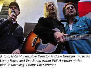 Last week over a hundred people, many of whom had attended shows at the Fillmore East, joined GVSHP, Two Boots, and Apple Bank for the unveiling of a historic plaque marking the site of the legendary Fillmore East. We were honored to also be joined by Joshua White of the Joshua Light Show — the psychedelic light experience which helped define Fillmore East concerts, music legend Lenny Kaye, who performed at the unveiling and spoke about his experiences attending shows at the Fillmore East, and Tom Birchard, owner of neighborhood institution Veselka, who provided food and spoke of his experiences at the renowned music venue as well. We also heard many great stories from attendees about their experiences not only at the Fillmore, but at the site’s prior and later incarnations as the Loew’s Commodore Movie House, the Village Theater, and the Saint nightclub. Video of the entire unveiling, including Lenny Kaye’s performance, can be found here, and photos from the event can be found here.