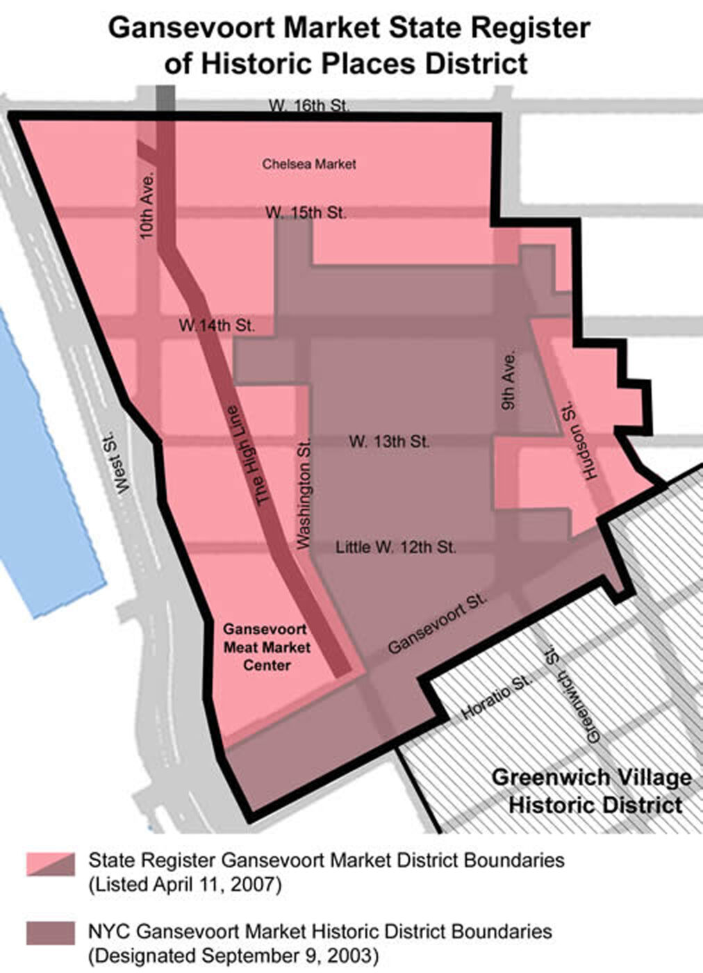 New York State Parks Commissioner Carol Ash today approved the listing of the entire Meatpacking District on the State and National Register of Historic Places. The district, known as the Gansevoort Market District, was nominated by GVSHP, which also succeeded in getting much of the neighborhood landmarked by New York City in 2003. The Meatpacking District is one of the last surviving market neighborhoods in New York City, containing a rich array of 19th and early 20th century commercial and vernacular architecture. While landmark designation protects some of the neighborhood’s historic buildings from being demolished, listing on the State and National Register of Historic Places entitles property owners to tax breaks and grants for preserving their historic buildings. Since the State and National Register District is significantly larger than the New York City landmark district (see map at right), the listing brings incentives for preserving historic buildings in unprotected areas of the Meatpacking District, while offering owners in landmarked areas financial assistance for complying with landmarks preservation requirements.