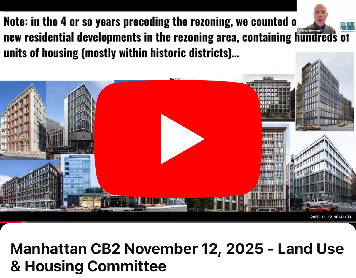 On Wednesday, Village Preservation Executive Director Andrew Berman presented to Community Board 2’s Land Use Committee our updated findings from our study about the failures and broken promises of the 2021 SoHo/Noho rezoning. Four years after the rezoning was approved over widespread community opposition, nearly all of our predictions about what the rezoning would actually do as opposed to what the City claimed have come true: not a single unit of affordable housing has been built; multiple units of existing affordable housing have been destroyed as a result of the rezoning; developments are moving ahead that are 100% super-luxury with no affordable component whatsoever; and planned developments that do include affordable units are segregating them into separate buildings rather than integrating them with market-rate ones as the city promised would occur. Luxury office and retail developments are rising where the city claimed affordable housing would be built or where no development would take place.