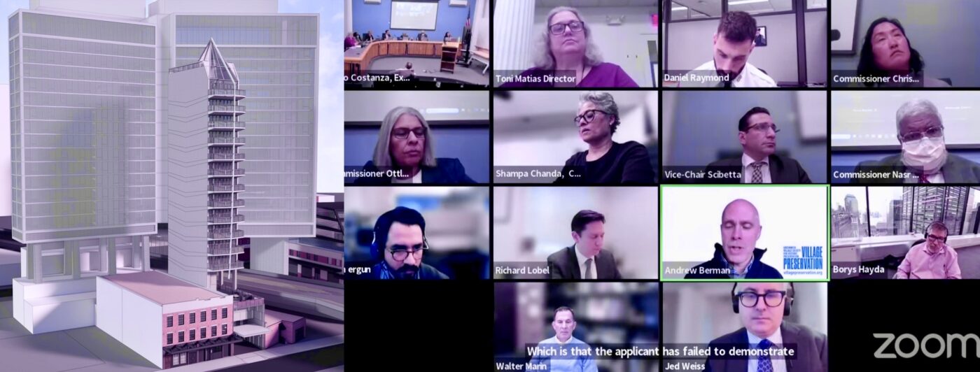The proposed tower with the zoning variance (l.); Village Preservation Exec. Dir. Andrew Berman testifying before the BSA (r.)