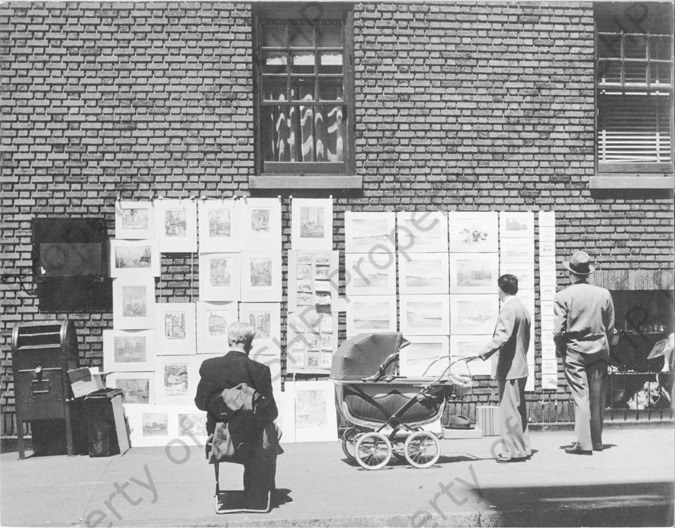 Man with stroller looking at a Washington Square Art Show display at 169 MacDougal Street/103 Waverly Place — now part of the Washington Square Hotel.