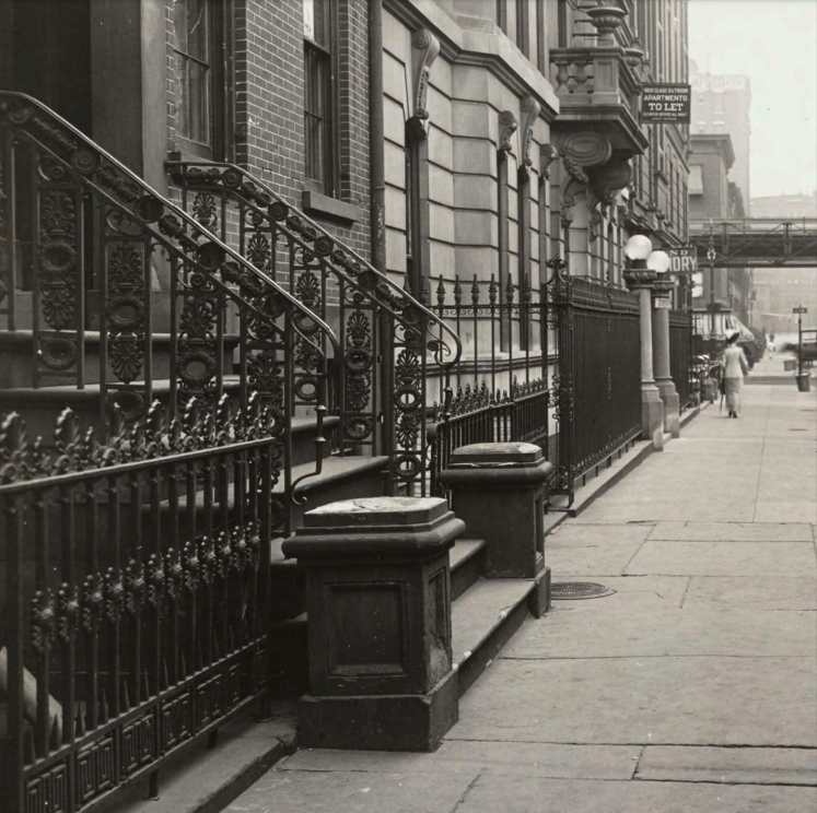 Stoop of 80 Washington Place with 82-84 Washington Place and no longer extant Sixth Avenue El in background, 1913 NYHS Photo
