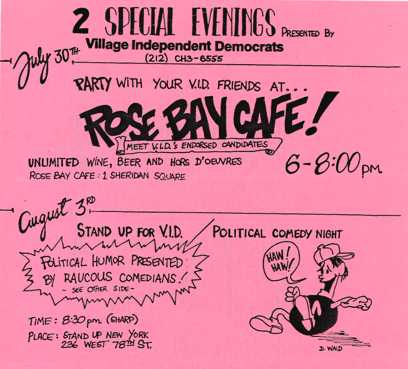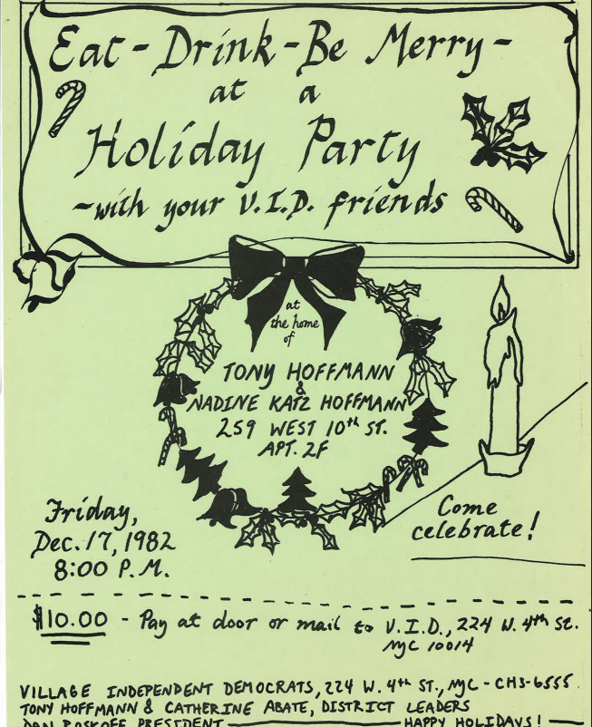 The Village Independent Democrats are a Greenwich Village-based reform Democratic club founded in 1956 which had a profound impact upon New York’s political history, and has shaped the political landscape of Greenwich Village and Lower Manhattan since the mid-20th century. The club helped end Tammany Hall control of Democratic politics in Manhattan, and launch the careers of notable NYC politicians including Ed Koch. This is the third batch of the club’s archives in our collection, detailing their activities in the 1980s. It includes their work on a range of local and national issues from rezonings in the neighborhood to tenant protection efforts, to supporting the Nuclear Freeze Campaign. It also includes the club’s 1982 split following the membership vote to support Mario Cuomo over longtime VID member and former local district leader and City Councilmember Ed Koch in the gubernatorial election. Those who supported Koch split off and founded the Village Reform Democratic Club (VRDC).
