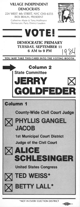 Flyer with history of Central Brooklyn Independent Democrats and Village Independent Democrats candidate endorsement. View as PDF.