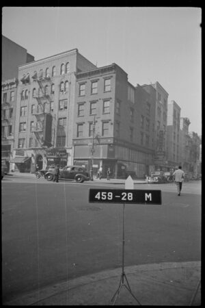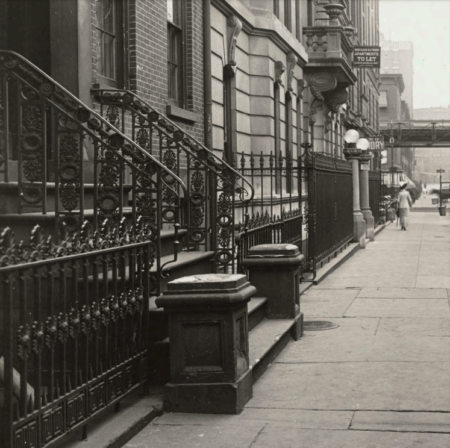 Southeast corner of Sixth Avenue and West 11th Street (now demolished), showing the Shearith Israel Cemetery on the left and 452 Sixth Avenue behind. The Sixth Avenue El is visible on the right, 1898. The six-story building behind the El has been demolished and replaced with today’s P.S. 41.